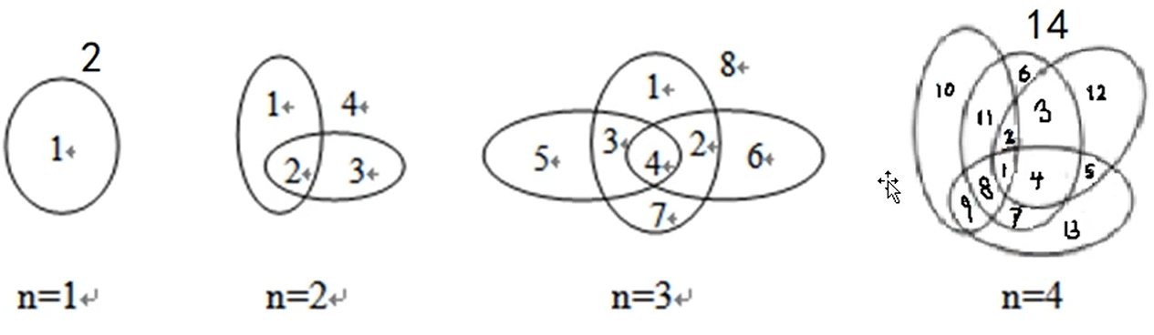 设有n条封闭曲线画在平面上,而任何两条封闭曲线恰好相交于两点,且任何三条封闭曲线不相交于同一点,问这些封闭曲线把平面分割成的区域个数。