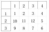 Mike为了验证自己设计的算法是否正确,打算先模拟一下这个算法,每当机器人走过一个单元格时,会在单元格内标记一个数字,这个数字从1开始,每经过一个单元格数字会递增1,直到所有的单元格都扫一遍,也就是所有的单元格都标记过数字,机器人会自动停止。 比如:如果机器人按照上面的规则,清扫一个3 * 4大小的矩形区域,那么标记数字的结果如下图所示。