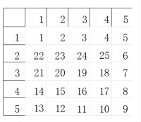再比如:如果机器人按照上面的规则,清扫一个5 * 5大小的矩形区域,那么标记数字的结果如下图所示。