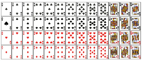 我们称一副扑克牌是完整的,当且仅当对于每一种花色和每一种点数,都恰好有一张牌具有对应的花色和点数。由此,一副完整的扑克牌恰好有 4×13=52 张牌。以下图片展示了一副完整的扑克牌里所有的 52 张牌。